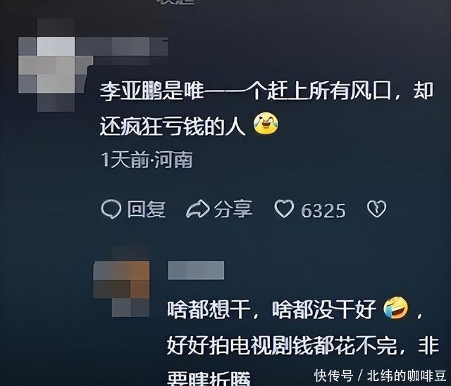 可李亚鹏不满足演戏,1998年就试水互联网,办婚礼网站“喜宴”,仨月就黄了,扩张太猛。2000年跟哥李亚炜搭北京美丽春天文化传播公司,投电视剧《海滩》和电影版《将爱情进行到底》,还行,但公司后来被举报经纪人违规,闹得鸡飞狗跳。 2010年他读长江商学院,野心更大,2011年办培德书院幼儿园,本想给李嫣上学用,砸上亿建硬件,学费每月过万,家长进门还得穿鞋套,高端得一批,可李嫣超龄没上成,园子倒盈利了。